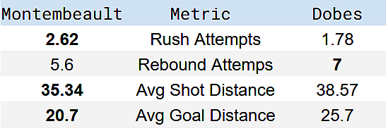 Montembeault deals with a lot more rush attempts than Dobes, though Dobes has been called-upon to deal with second-chance scoring opportunities with more regularity.