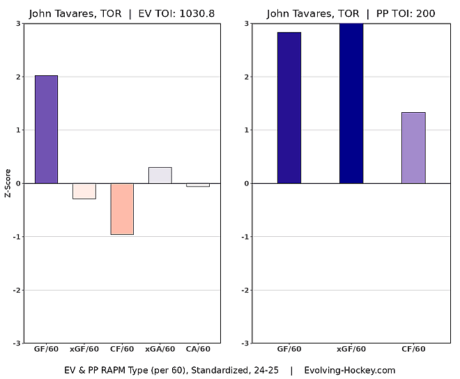 He’s no spring chicken, but Tavares is still a very good player, which much of his impact coming via his powerplay usage. He’s also a talented playmaker, which would suit a winger such as Demidov.