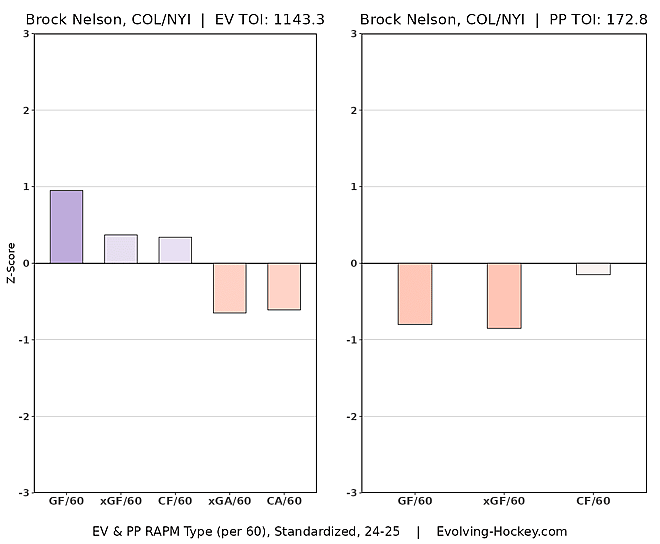 While Nelson was playing for the New York Islanders, it seemed that his numbers were set to go full Thelma And Louise, but a trade to the Colorado Avalanche put the brakes on any potential cliff dive. It’s a good reminder that playing for a mediocre team tends to lead to mediocre possession numbers, therefore we can’t simply dismiss half the league because they’re on a poorly constructed roster.