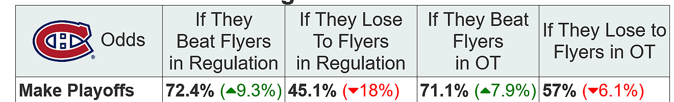 With the win, the Canadiens now have a 72.4 percent chance of making the playoffs by capturing the final Wild Card spot in the Eastern Conference.