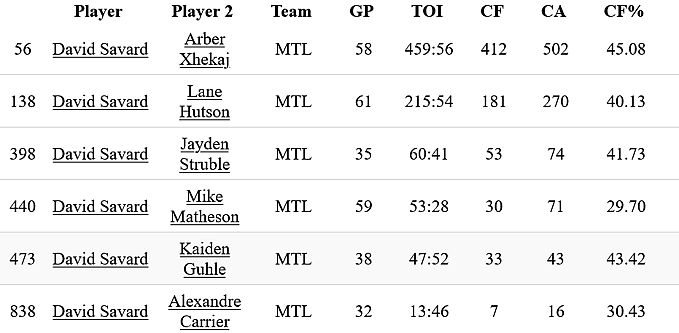 But when Hutson played with Savard, they were outshot by a significant margin. To the point that you could say it was one of the worst combinations in the NHL this season.