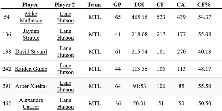 To give you an idea of the numbers, CF% is the shot share when a certain player is on the ice. For example, when Mike Matheson and Hutson played together, they controlled 54% of the shots (523-439). Jayden Struble and Hutson control over 55% of the shots, an encouraging sign when we consider Struble was on the outside looking in earlier in the year.