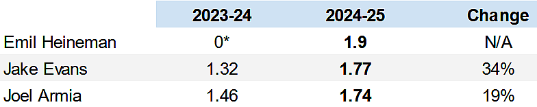 To get a better idea of which players have contributed more from an offensive standpoint, we’ll evaluate the current scoring paces (points per 60 at 5v5) from the forwards compared to how well they produced in 2023-24. Percentages are represented by two colours, with red serving as a signal that the player’s production has decreased this season.