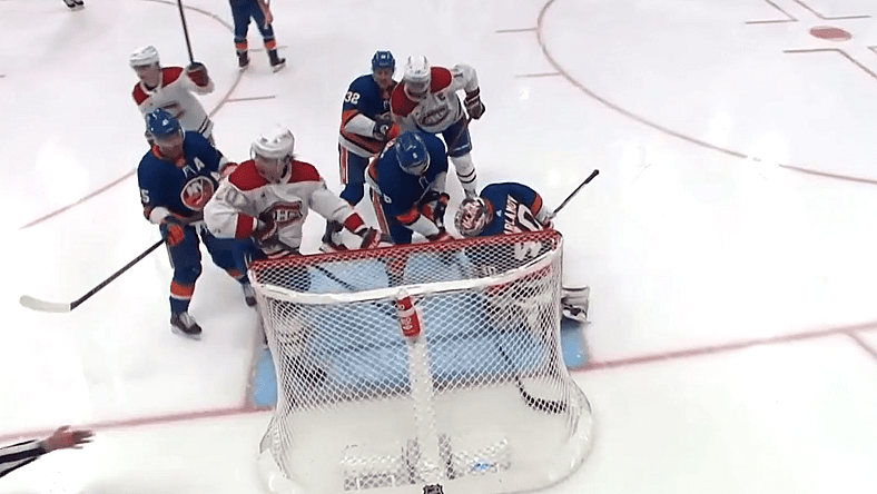 Johnathan Kovacevic was trying to clear the crease, but his battle with an Islanders forward led to a situation that interfered with Samuel Montembeault’s ability to reset. Jayden Struble was tasked with covering Cizikas, but couldn’t maintain a tight gap between the two players.