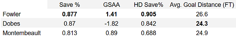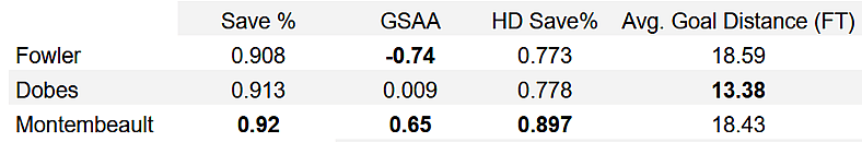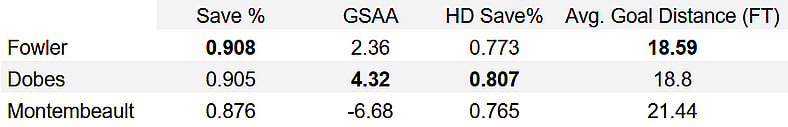 As you can see below, both Dobes and Montembeault produced a stronger save percentage, though it should be noted they played fewer games than Fowler. Montembeault played in four games, while Dobes was given five starts.