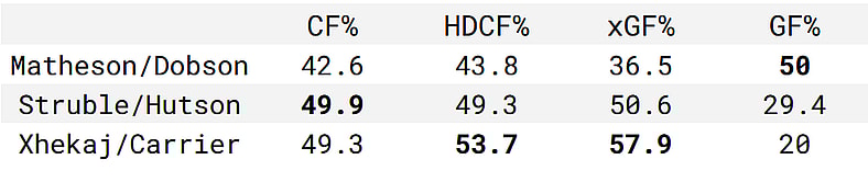As for the second and third pairing, it’s almost a polar opposite situation. They’ve both done a good job controlling shots, and their share of high-danger chances is much healthier, which leads to a higher share of the expected goals.