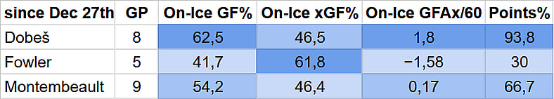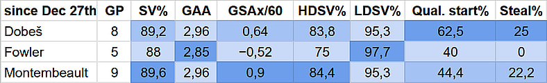 Thus, statistically it seems that lately, both Dobeš and Montembeault have not only been very important for their team’s success but also performing very similarly.