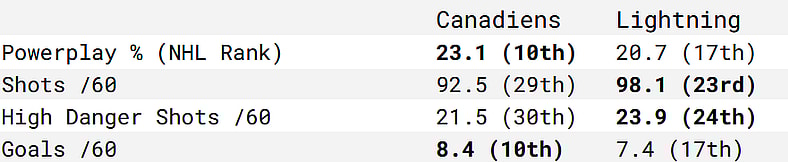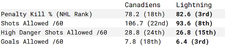 The Canadiens are the better team on the powerplay, but the same cannot be said on the penalty kill. The Lightning kill more penalties, allow fewer regular and high-danger scoring chances, not to mention actual goals.