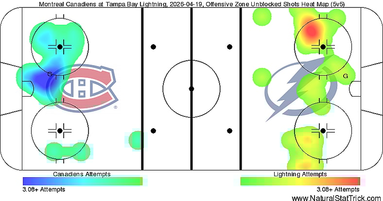 The Canadiens took many of their shots from the slot, while the Lightning were largely kept to the perimeter.