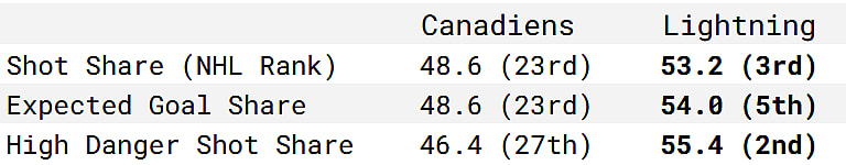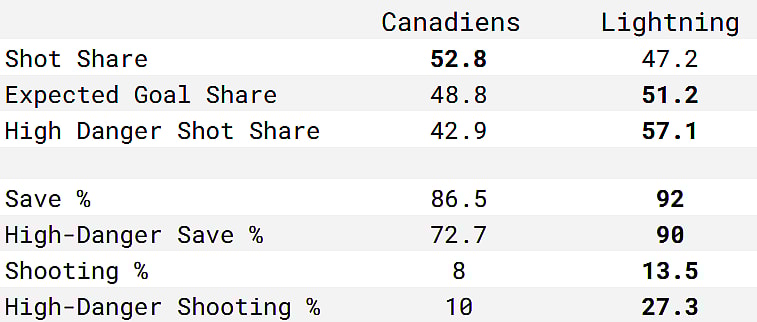 Simply put, they capitalized on their chances with a much higher frequency than the Habs, while being outshot by a team that struggled to generate many shots throughout the season. This doesn’t necessarily mean the Montreal Canadiens will outshoot the Lightning in every game, but it’s definitely a situation worth keeping in mind as we await puck drop in Game One of the first-round series.