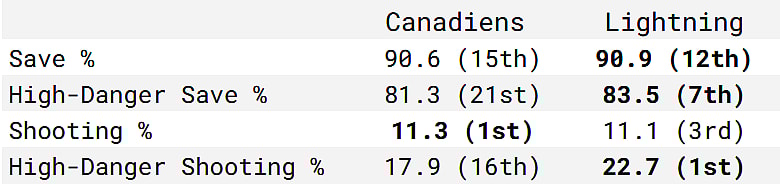 That being said, at the very least, you can argue that Habs have slightly better accuracy, though the Lightning are first in the NHL when it comes to their high-danger shooting percentage, which mitigates much of the advantage the Canadiens have in the shooting department.