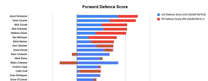 As we can see, per this metric, only four forwards have a better Defence Score than Nick Suzuki this season. While Suzuki’s overall score is probably better than it should be because of a relatively light workload on PK, only eight forwards of the above-mentioned group of 41 have put up better defensive numbers at 5v5 than Suzuki.
