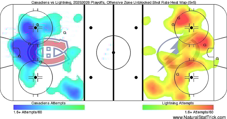 The Lightning have controlled the majority of the shots at 5v5, to the tune of 55.4%. However, it’s the Montreal Canadiens that have managed to create the most high-danger scoring opportunities.