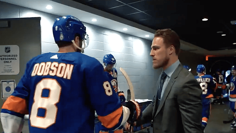The Islanders captain is later seen in the video after the Islanders won all smiles as he congratulated Josh Bailey on his goal and watched as Ryan Pulock presented Matt Martin with the Islanders bomber jacket for his game-winning goal.