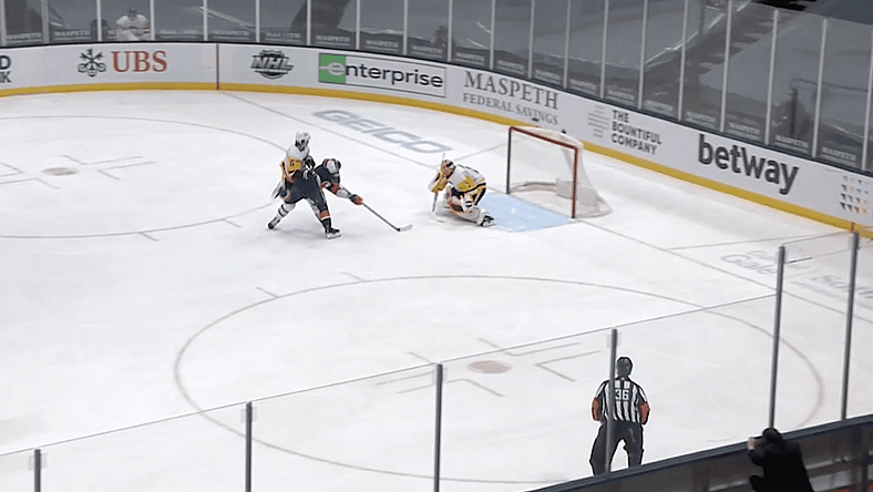 Casey Cizikas was able to move the puck from his forehand to his backhand and then back to his forehand to push the puck past Casey DeSmith. All of that occurred while Cizikas was falling down as well.