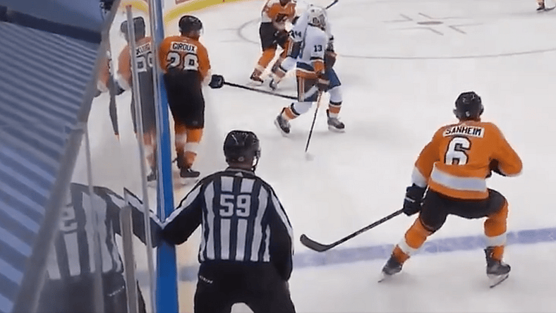 #Isles Mathew Barzal hit with a high-stick here from the #AnytimeAnywhere Claude Giroux follow-through.