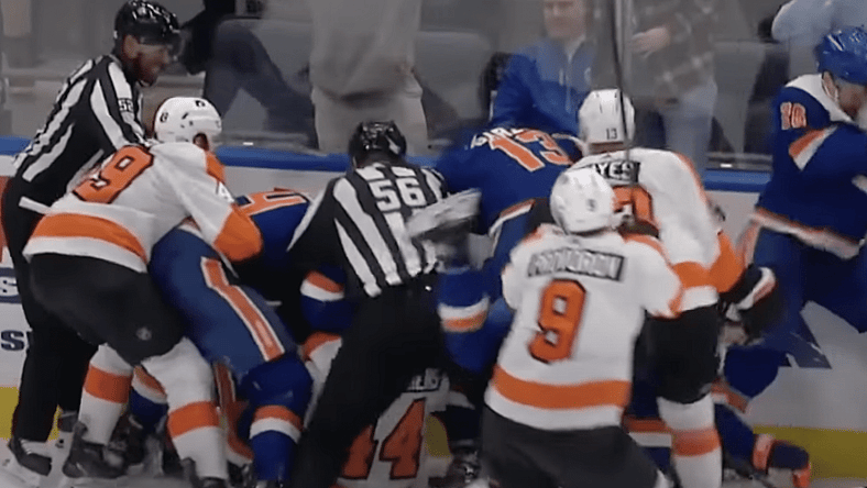 The New York Islanders and Philadelphia Flyers are not two teams that like each other very much. The bad blood was back on Saturday night in the Islanders’ 5-2 win over the Flyers, as we witnessed a scrum late in the third period.