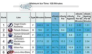 Those Edmonton trio played just over 250 minutes together, while the Colorado trio played just 217 minutes, roughly two more games together than Dobson and Pelech, making it an extremely compatible comparison. Dobson-Pelech made up the second-best forward/defenseman grouping in the NHL, falling just behind Tampa Bay’s Hagel-Cirelli-Kucherov line that played 246 minutes together throughout the season.