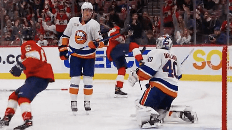 The New York Islanders continue to turn the puck over in their own zone, and they did so just 39 seconds into the contest. Adam Pelech, the Islanders’ best defenseman, coughed the puck up to Anton Lundell. But the ensuing shot should have been stopped by Semyon Varlamov, but it trickled in off his blocker.
