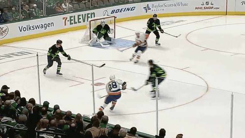 On Barzal’s first goal of the season early in the second period, hard work by Oliver Wahlstrom led to an Alexander Romanov wrist shot from the left point. We don’t see it often, but we saw it there as Barzal cut across the slot and deflected the shot over Dallas Stars netminder Jake Oettinger’s blocker.