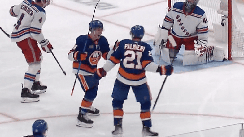 Thanks to hard work in the offensive zone, Palmieri made a move to the slot. The puck bounced off his stick but right to Jean-Gabriel Pageau, who made a heads-up play to poke the puck to Palmieri, which allowed him to have a wide-open shooting lane on New York Rangers netminder Jaroslav Halak.
