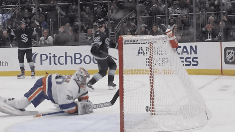 Oliver Bjorkstrand gave the Kraken a 3-1 lead at 13:04 of the second period for his fifth of the season as he buried a rebound. Jamie Oleksiak and Yanne Gourde were credited with the assists.