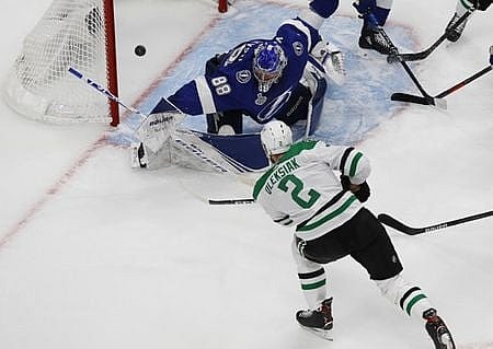 Tampa Bay tied the game seven minutes later when the rebound from a Blake Coleman shot deflected off teammate Yanni Gourde and then Dallas forward Roope Hintz before sliding into the net.