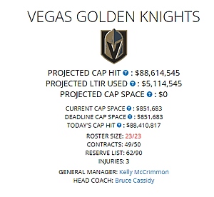 The Golden Knights are maxed out on roster size and have $0.00 available of cap space. Outside of a player suffering a season-ending injury and going to LTIR, the path to Kane becoming a member of the Golden Knights is tricky.