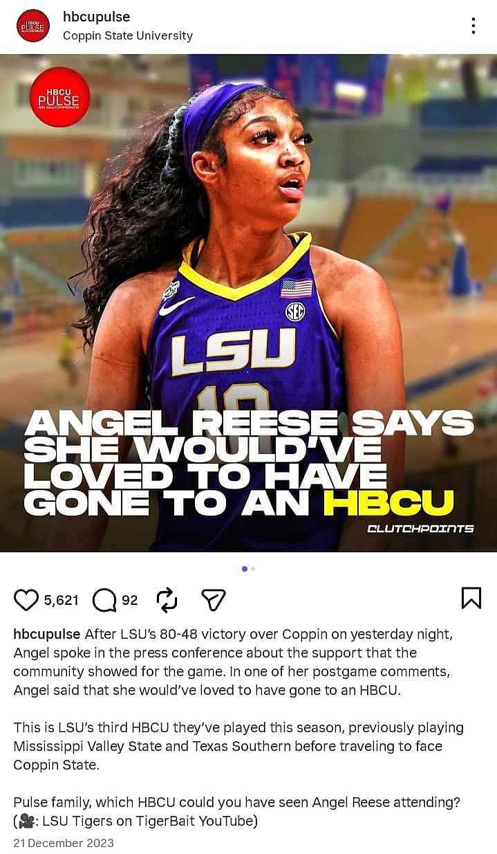 This isn’t the first time that Angel Reese has expressed her support for HBCUs and her desire to have attended one. In 2023 following LSU’s victory over Coppin State, Reese declared publicly that she would’ve attended an HBCU.