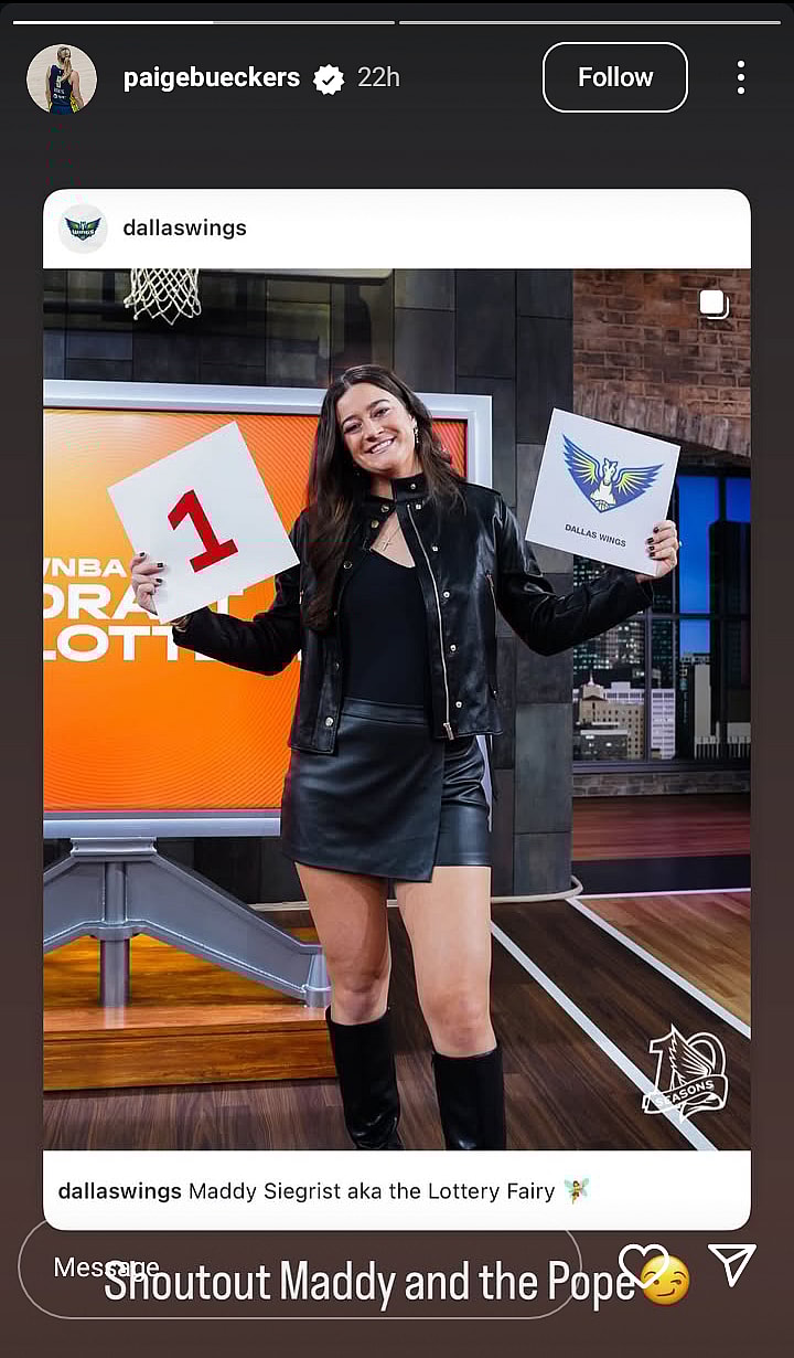 Bueckers reacted excitedly to the Wings’ lottery win on Sunday via her Instagram story, while hailing her $94,740-per-year teammate Maddy Siegrist who represented the team at the event and Pope Leo XIV.