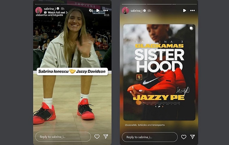 Following Davidson’s homage to the WNBA star on Tuesday night, Sabrina Ionescu shouted out the USC player’s PE edition of her signature sneakers on Instagram after the game.